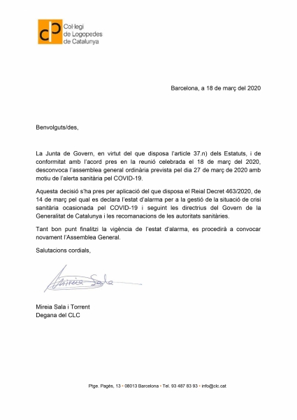 Ajornament de l'assembla general ordinària prevista per el dia 27 de març