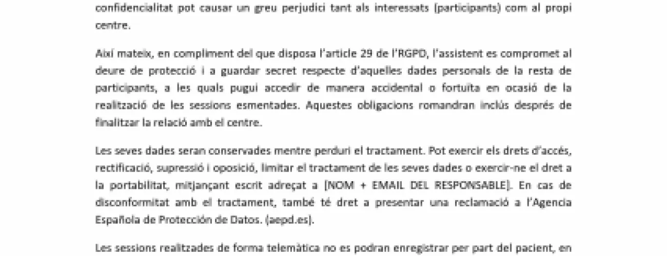Per indicació de Microlab us informem del text que podeu fer servir per demanar l'autorització per a les sessions telemàtiques i així queda cobert el tema de la privacitat i la no difusió de les sessions.