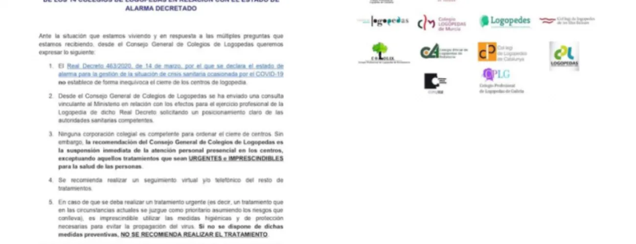 Adjuntem comunicat del Consejo General de Colegios de Logopedas i dels 14 col·legis de logopedes d'Espanya davant l'alerta sanitària provocada pel COVID-19.