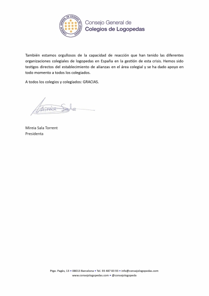 Comunicat de la presidenta del consejo general de colegios de logopedas