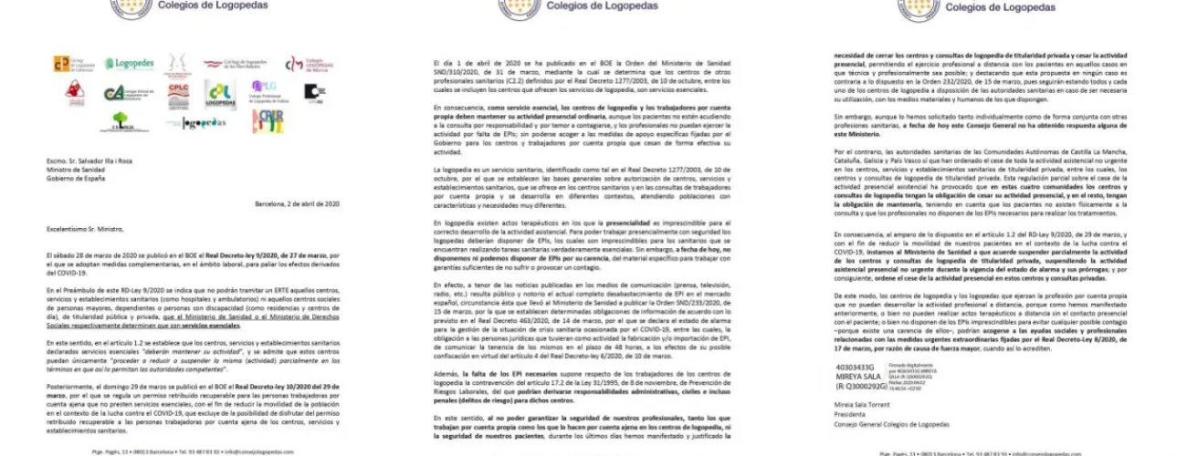Adjuntem nou comunicat del Consejo General de Colegios de Logopedas i els 14 col·legis de logopedes autonòmics d'Espanya instant a l'Ministeri de Sanitat a que acordi suspendre parcialment l'activitat dels centres i consultes de logopèdia de titularitat privada, suspenent l'activitat assistencial presencial no urgent durant la vigència de l'estat d'alarma i les seves pròrrogues; i per tant, ordeni el cessament de l'activitat presencial a aquests centres i consultes privades. D'aquesta manera, els centres de logopèdia i els logopedes que exerceixin la professió per compte propi que no puguin desenvolupar l'activitat professional a distància perquè o bé no poden realitzar actes terapèutics a distància sense el contacte presencial amb el pacient; o bé no disposen dels EPI imprescindibles per evitar qualsevol possible contagi -perquè hi ha una manca d'ells-, podrien acollir-se als ajuts socials i professionals relacionats amb les mesures urgents extraordinàries fixades pel Reial decret llei 8/2020, de 17 de març, per raó de causa de força major, quan així ho acreditin.
