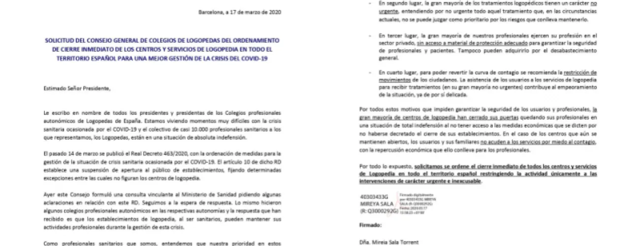 La presidenta de Consejo General de Colegios de Logopedas, Mireia Sala, ha escrit una carta en nom de tots els presidents i presidentes dels Col·legis professionals autonòmics de Logopedes d'Espanya per explicar al president que estem vivint moments molt difícils amb la crisi sanitària ocasionada per el COVID-19 i que el col·lectiu de gairebé 10.000 logopedes espanyols estan en una situació d'absoluta indefensió.