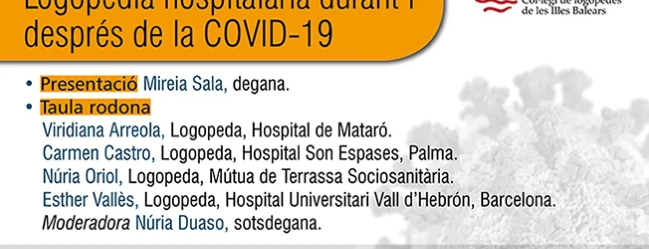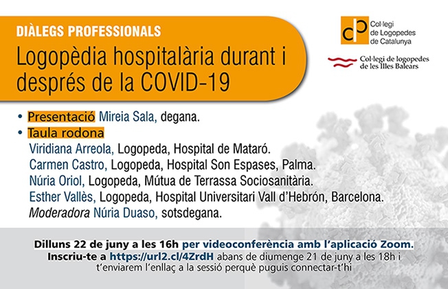 Logopèdia hospitalària durant i després de la COVID-19 22 de Juny a les 16 h a través de la plataforma Zoom Inscriu-te a https://url2.cl/4ZrdH abans de diumenge 21 de juny a les 18 h i t'enviarem l'enllaç a la sessió perquè puguis connectar-t'hi.