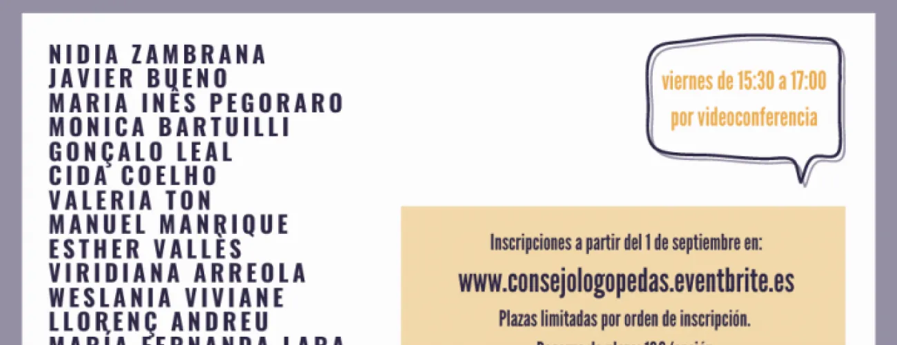 Des del Consejo General de Colegios de Logopedas compartim el projecte de Formació Continua en Temps de COVID-19 amb la col·laboració dels 14 col·legis de logopedes autonòmics. Programa i inscripcions: http://www.consejologopedas.eventbrite.es Divendres de 15:30 a 17:00 h per videoconferència. Inscripcions a partir de l'1 de setembre. Places limitades per ordre d'inscripció. Reserva de plaça: 10 €/sessió.