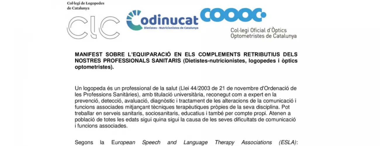 Manifest sobre l'equiparació en els complements retributius dels nostres professionals sanitaris (Dietistes-nutricionistes, logopedes i òptics optometristes)