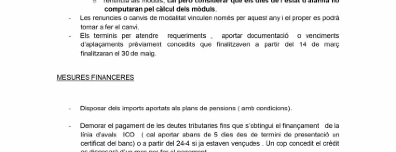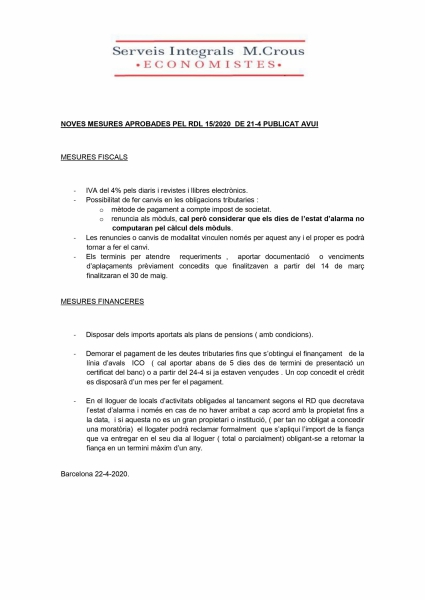 Adjuntem document amb noves mesures fiscals i financeres aprovades per el RDL 15/2020.