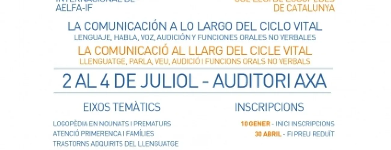 Us comuniquem que ja s'ha fet públic el web del XXXII Congrés Internacional d'AELFA-IF i V Congrés del Col·legi de Logopedes de Catalunya on hi trobareu el programa, i altres informacions rellevants com els comitès, la normativa per a l'enviament de comunicacions i la informació sobre les inscripcions.