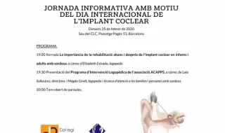 Amb motiu del Dia Internacional de l'Implant Coclear, el proper 25 de febrer, l'associació ACAPPS i el Col·legi de Logopedes de Catalunya organitzem una jornada informativa sobre la logopèdia per a infants i persones amb sordesa amb implant coclear. Us hi esperem!