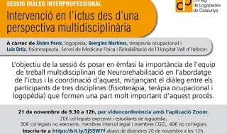 INTERVENCIÓ EN L'ICTUS DES D'UNA PERSPECTIVA MULTIDISCIPLINÀRIA A càrrec de l'Álvaro Pérez, Georgina Martínez i Luis Ortiz 21 de novembre de 9.30 a 12 h (per videoconferència amb l'aplicació Zoom) Inscriu-te a: https://bit.ly/3j55W7f abans de divendres 20 de novembre a les 12 h 20 € col·legiats e