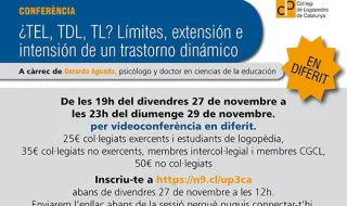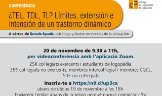 A càrrec de Gerardo Aguado, psicòleg i doctor en ciències de l'educació 20 de novembre de 9.30 a 11 h (per videoconferència amb l'aplicació Zoom) Inscriu-te a https://bit.ly/34XoL8Z abans de dijous 19 de novembre a les 18 h 25 € col·legiats exercents i estudiants de logopèdia 35 € col·legiats no