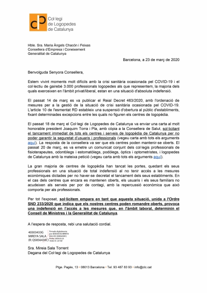 Adjuntamos carta enviada a la Consejera de Empresa i Coneixement, Hble. Sra. Maria Àngels Chacón i Feixas.