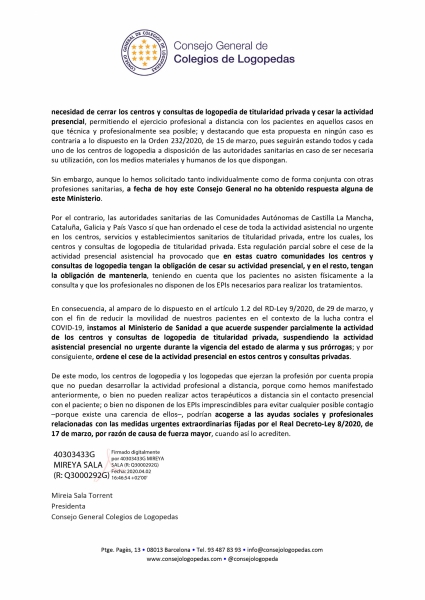 El cgcl y los 14 colegios autonómicos de logopedas de españa solicitan de nuevo el cierre de centros al ministerio de sanidad.