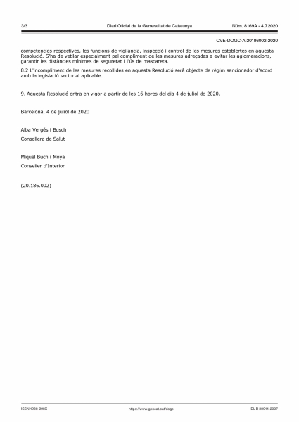 El sábado 4 de julio se publicó la Resolución SLT/1608/2020 por la cual se adoptan medidas especiales en materia de salud pública para la contención del brote epidémico de la pandemia de la COVID-19 en la comarca del Segrià.