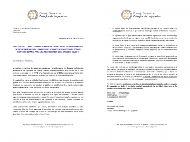 Por todo lo expuesto, el Consejo ha solicitado que se ordene el cierre inmediato de todos los centros y servicios de Logopedia en todo el territorio español restringiendo la actividad únicamente a las intervenciones de carácter urgente e inexcusable.