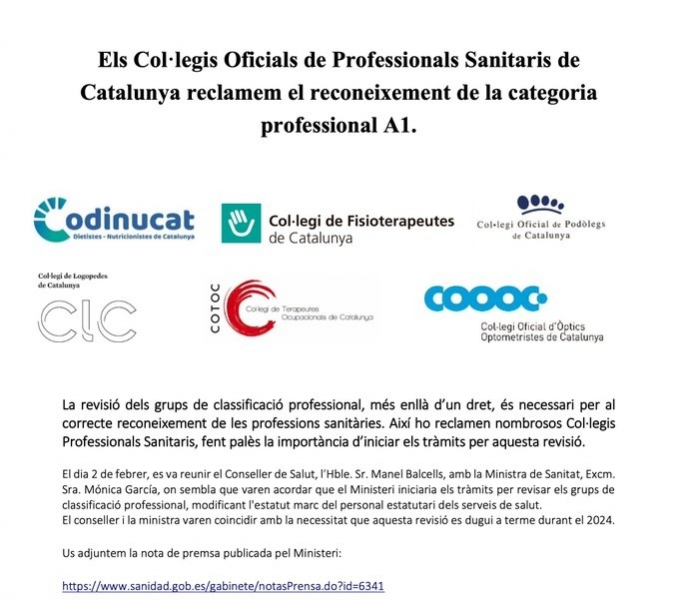 Reclamamos el reconocimiento de la categoría profesional A1: Manifiesto de los Colegios Profesionales Sanitarios de Catalunya. Col·legi de Dietistes-Nutricionistes de Catalunya Col·legi de Fisioterapeutes de Catalunya Col·legi Oficial de Podòlegs de Catalunya Col·legi de Terapeutes Ocupacionals de Catalunya Col·legi Oficial d'Òptics Optometristes de Catalunya Col·legi de Logopedes de Catalunya