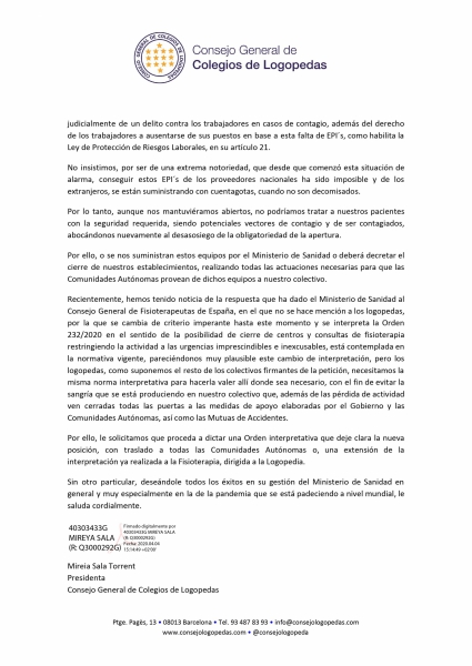 Adjuntamos nueva carta del Consejo General de Colegios de Logopedas enviada al Ministro de Sanidad.