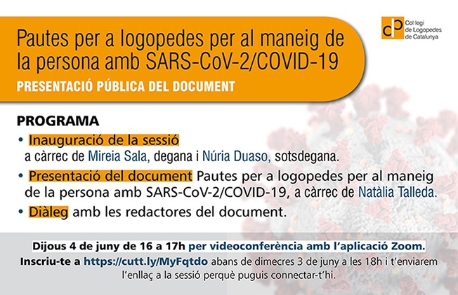 - Presentación del documento "Pautas para logopedas para el manejo de la persona con SARS-CoV-2/COVID-19", a cargo de Natàlia Talleda