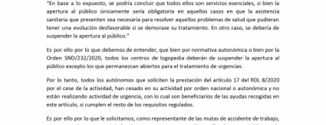 El CGCL pide a AMAT que las Mutuas acepten las solicitudes de cese de actividad presentadas por logopedas por Suspensión de la actividad por consecuencia directa de la declaración del estado de alarma.